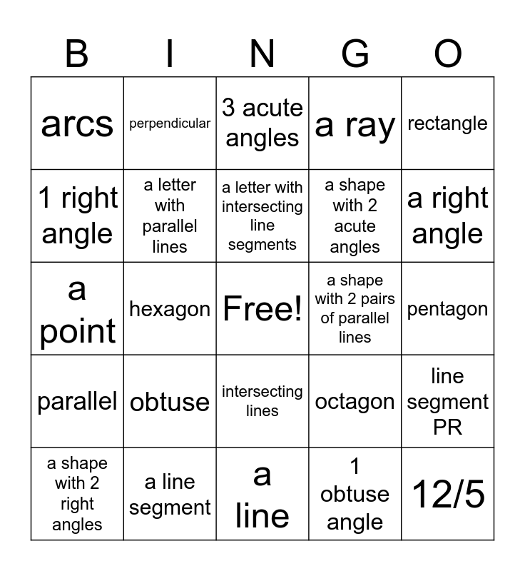 This bingo card has a free space and 28 words: line segment PR, line segment PQ, a shape with 2 acute angles, 1 obtuse angle, 1 right angle, 3 acute angles, perpendicular, parallel, a shape with 2 pairs of parallel lines, a shape with 2 right angles, a point, a ray, a line segment, a line, a right angle, acute, obtuse, a letter with parallel lines, a letter with intersecting line segments, intersecting lines, arcs, 8/3, 12/5, hexagon, pentagon, octagon, rectangle and trapezoid.