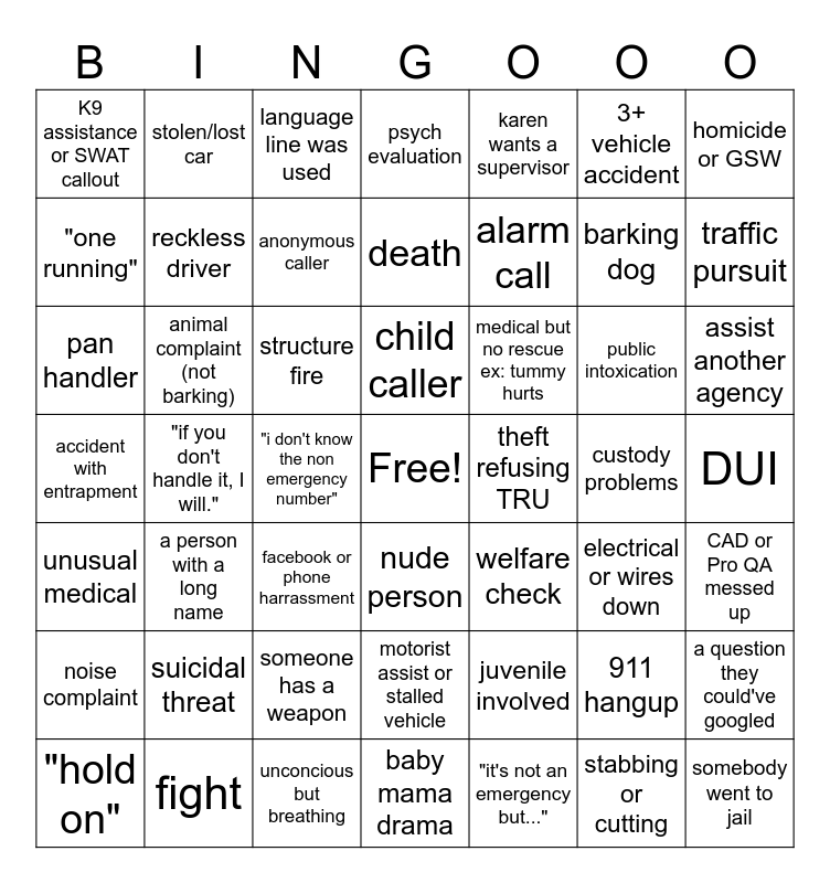 This bingo card has a free space and 48 words: juvenile involved, barking dog, baby mama drama, "if you don't handle it, I will.", structure fire, DUI, stolen/lost car, fight, 3+ vehicle accident, nude person, homicide or GSW, psych evaluation, public intoxication, medical but no rescue ex: tummy hurts, noise complaint, custody problems, "one running", traffic pursuit, 911 hangup, karen wants a supervisor, alarm call, "i don't know the non emergency number", K9 assistance or SWAT callout, reckless driver, a question they could've googled, anonymous caller, assist another agency, "hold on", child caller, animal complaint (not barking), stabbing or cutting, theft refusing TRU, CAD or Pro QA messed up, suicidal threat, accident with entrapment, welfare check, electrical or wires down, pan handler, facebook or phone harrassment, someone has a weapon, unusual medical, somebody went to jail, language line was used, unconcious but breathing, death, motorist assist or stalled vehicle, a person with a long name and "it's not an emergency but...".