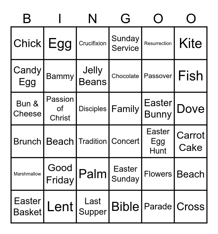 This bingo card has 36 words: Easter Sunday, Palm, Bible, Candy Egg, Brunch, Family, Bammy, Last Supper, Resurrection, Flowers, Fish, Sunday Service, Beach, Passion of Christ, Chocolate, Chick, Marshmallow, Easter Bunny, Bun & Cheese, Crucifixion, Disciples, Beach, Concert, Tradition, Easter Egg Hunt, Egg, Passover, Lent, Jelly Beans, Kite, Cross, Easter Basket, Carrot Cake, Dove, Good Friday and Parade.