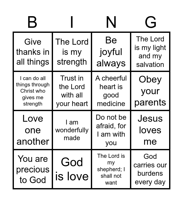 This bingo card has 16 words: God is love, Jesus loves me, Be joyful always, Give thanks in all things, Love one another, The Lord is my strength, Do not be afraid, for I am with you, The Lord is my shepherd; I shall not want, I can do all things through Christ who gives me strength, Trust in the Lord with all your heart, You are precious to God, The Lord is my light and my salvation, I am wonderfully made, Obey your parents, A cheerful heart is good medicine and God carries our burdens every day.