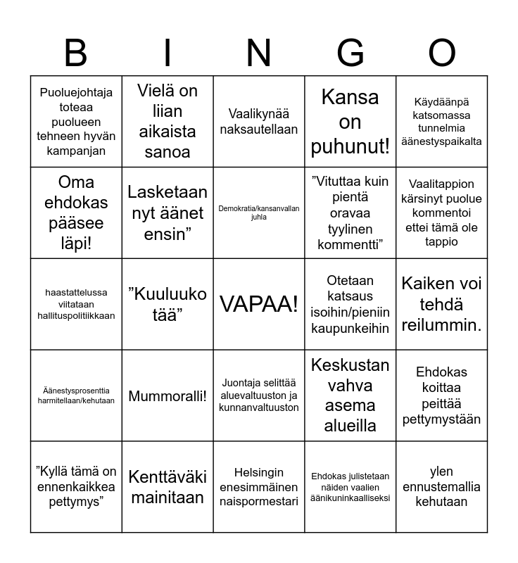 This bingo card has a free space and 24 words: Mummoralli!, Kenttäväki mainitaan, Demokratia/kansanvallan juhla, ”Kyllä tämä on ennenkaikkea pettymys”, Käydäänpä katsomassa tunnelmia äänestyspaikalta, Puoluejohtaja toteaa puolueen tehneen hyvän kampanjan, Oma ehdokas pääsee läpi!, Vielä on liian aikaista sanoa, Otetaan katsaus isoihin/pieniin kaupunkeihin, Juontaja selittää aluevaltuuston ja kunnanvaltuuston, ”Vituttaa kuin pientä oravaa tyylinen kommentti”, haastattelussa viitataan hallituspolitiikkaan, Keskustan vahva asema alueilla, Ehdokas koittaa peittää pettymystään, Lasketaan nyt äänet ensin”, Ehdokas julistetaan näiden vaalien äänikuninkaalliseksi, Kaiken voi tehdä reilummin., Vaalikynää naksautellaan, Vaalitappion kärsinyt puolue kommentoi ettei tämä ole tappio, ”Kuuluuko tää”, ylen ennustemallia kehutaan, Äänestysprosenttia harmitellaan/kehutaan, Kansa on puhunut! and Helsingin enesimmäinen naispormestari.