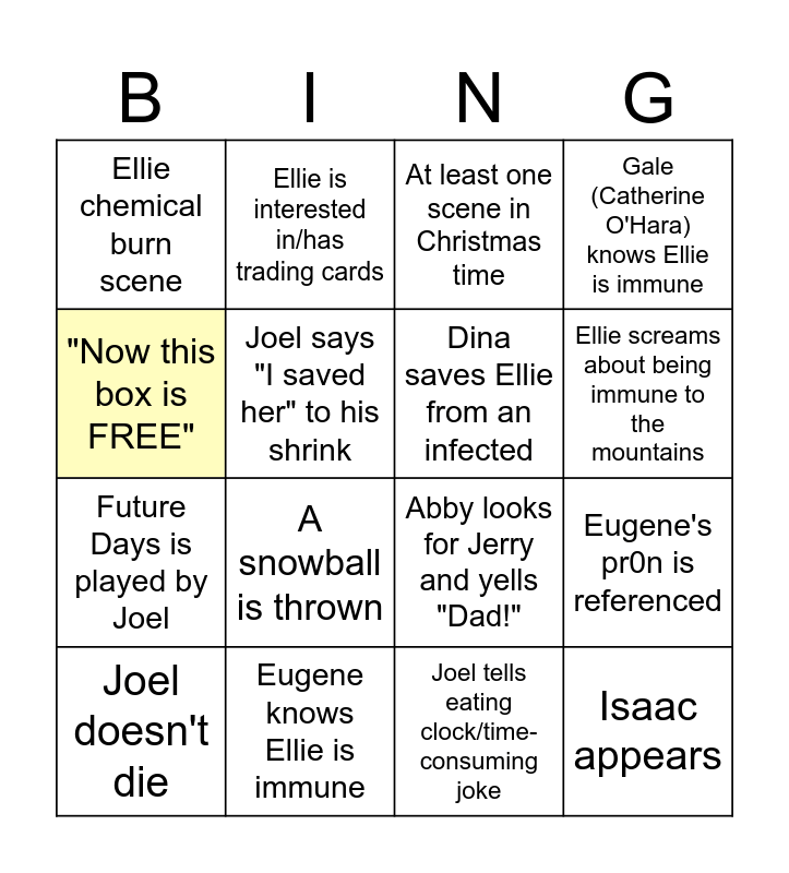 This bingo card has 44 words: Joel dies, Joel doesn't die, Kat appears, Buckley appears, A red door is visible, A molly is used, At least one scene in Christmas time, Carnival/Festival scene (from deleted scenes of game), "Now this box is FREE", Bigot sandwich is mentioned, Gale (Catherine O'Hara) knows Ellie is immune, Eugene knows Ellie is immune, Joel kills Eugene, Owen leads Abby to see Jackson, We see young Manny when Abby finds dead Jerry, Jerry knows Abby and Owen like each other romantically, Jerry gives Abby tracking lesson, Abby looks for Jerry and yells "Dad!", Abby gives death blow to Joel with golf club, A snowball is thrown, Ellie is interested in/has trading cards, Savage Starlight appears or is referenced, Ellie tattooing scene, Ellie chemical burn scene, Joel says "gee-tar" or funny way, Joel tells eating clock/time-consuming joke, At least one obvious shot of Seattle (or area), Jesse wakes up Ellie, Cameo from game crew (not Isaac), Isaac appears, Ellie verbally thanks Dina (for anything), Dina disrupts Ellie's path, Coffee is mentioned, Eugene's weed room appears, Eugene's pr0n is referenced, Ellie and Dina smoke, Ellie and Dina hook up, Dina breaks a jar of joints, Ellie screams about being immune to the mountains, Joel says "I saved her" to his shrink, Future Days is played by Joel, Gale (Catherine/Moira) utters "baby" (in any manner), Dina saves Ellie from an infected and There's a horse named Japan.