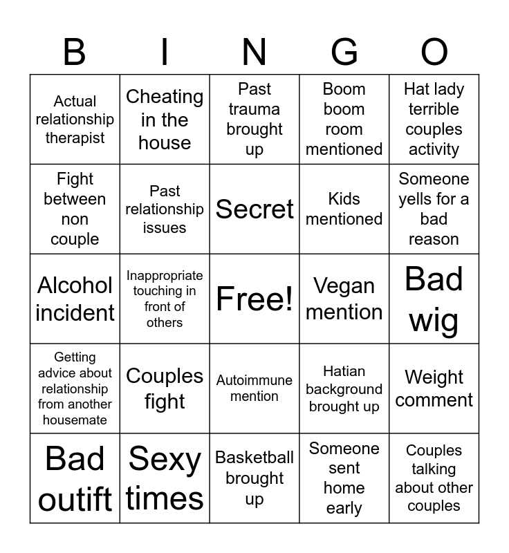 This bingo card has a free space and 24 words: Couples fight, Sexy times, Secret, Bad outift, Hat lady terrible couples activity, Actual relationship therapist, Fight between non couple, Cheating in the house, Vegan mention, Autoimmune mention, Kids mentioned, Alcohol incident, Hatian background brought up, Weight comment, Past relationship issues, Someone sent home early, Bad wig, Past trauma brought up, Someone yells for a bad reason, Inappropriate touching in front of others, Couples talking about other couples, Getting advice about relationship from another housemate, Boom boom room mentioned and Basketball brought up.