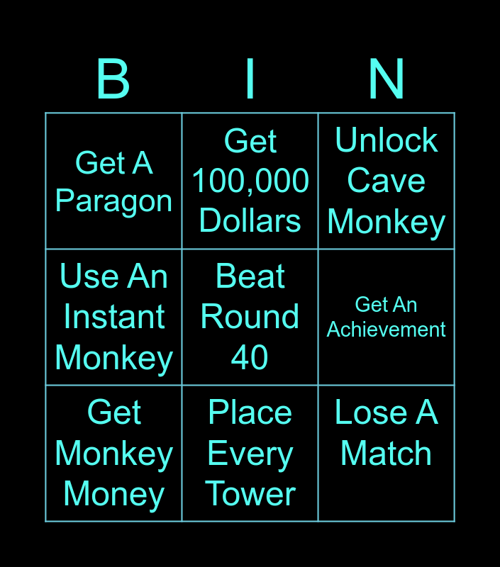 This bingo card has a free space and 8 words: Get An Achievement, Unlock Cave Monkey, Get 100,000 Dollars, Get Monkey Money, Get A Paragon, Lose A Match, Use An Instant Monkey and Place Every Tower.