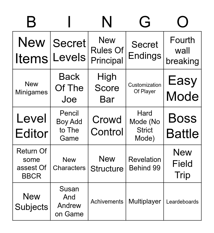 This bingo card has a free space and 24 words: New Characters, Susan And Andrew on Game, High Score Bar, New Subjects, Fourth wall breaking, New Items, New Minigames, Secret Levels, Hard Mode (No Strict Mode), New Structure, Customization Of Player, Level Editor, Revelation Behind 99, New Field Trip, Back Of The Joe, Multiplayer, Boss Battle, New Rules Of Principal, Easy Mode, Pencil Boy Add to The Game, Leardeboards, Return Of some assest Of BBCR, Secret Endings and Achivements.