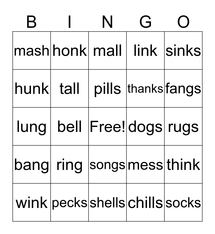 This bingo card has a free space and 31 words: shells, fuss, bell, tan, mash, mall, tall, mess, dogs, chills, rugs, socks, paths, shops, fangs, sung, think, ring, bang, songs, sinks, chunks, wink, honk, thanks, hunk, link, lung, pecks, pills and chips.