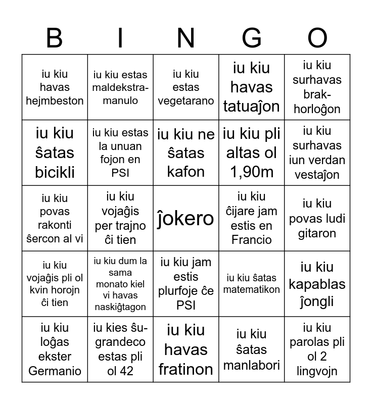 This bingo card has a free space and 29 words: iu kiu loĝas ekster Germanio, iu kies persona nomo komenciĝas per vokalo, iu kiu vojaĝis per trajno ĉi tien, iu kiu naskiĝis dum la sama jaro kiel vi, iu kiu havas hejmbeston, iu kiu estas vegetarano, iu kiu estas la unuan fojon en PSI, iu kiu dum la sama monato kiel vi havas naskiĝtagon, iu kiu ĉijare jam estis en Francio, iu kies ŝu-grandeco estas pli ol 42, iu kiu povas ludi gitaron, iu kiu parolas pli ol 2 lingvojn, iu kiu havas fratinon, iu kiu ŝatas manlabori, iu kiu surhavas iun verdan vestaĵon, iu kiu ne posedas aŭton, iu kiu jam estis plurfoje ĉe PSI, iu kiu vojaĝis pli ol kvin horojn ĉi tien, iu kiu surhavas brak-horloĝon, iu kiu povas rakonti ŝercon al vi, iu kiu ŝatas matematikon, iu kiu kantas en koruso, iu kiu pli altas ol 1,90m, iu kiu ŝatas bicikli, iu kiu havas tatuaĵon, iu kiu estas maldekstra-manulo, iu kiu kapablas ĵongli, iu kiu ne ŝatas kafon and iu kiu ŝatas tabulludi.