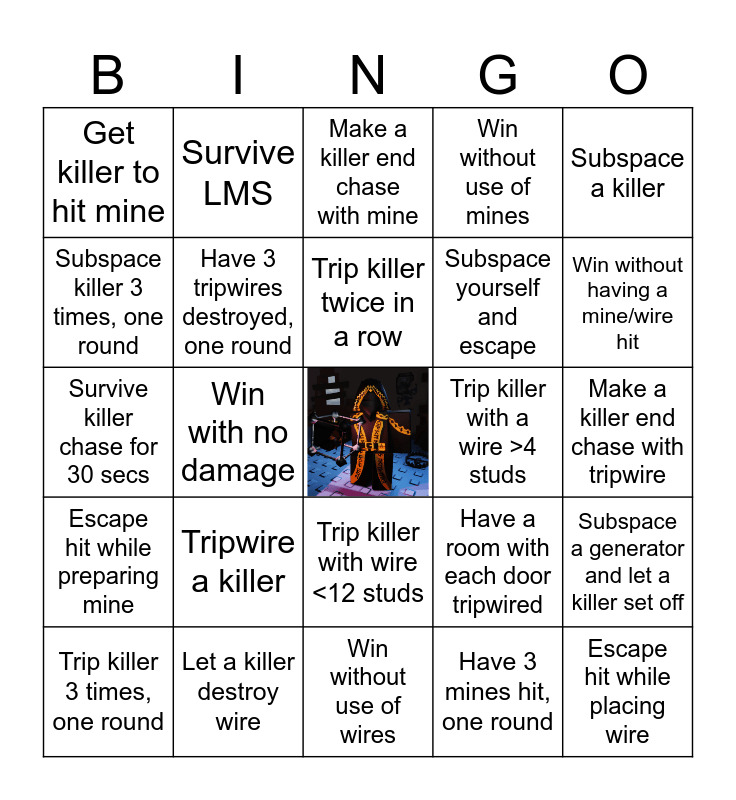 This bingo card has a free space and 24 words: Tripwire a killer, Let a killer destroy wire, Trip killer twice in a row, Trip killer 3 times, one round, Subspace a killer, Get killer to hit mine, Subspace killer 3 times, one round, Survive LMS, Trip killer with a wire >4 studs, Trip killer with wire <12 studs, Subspace yourself and escape, Survive killer chase for 30 secs, Have a room with each door tripwired, Subspace a generator and let a killer set off, Have 3 tripwires destroyed, one round, Have 3 mines hit, one round, Make a killer end chase with tripwire, Make a killer end chase with mine, Win without having a mine/wire hit, Win with no damage, Escape hit while placing wire, Escape hit while preparing mine, Win without use of mines and Win without use of wires.