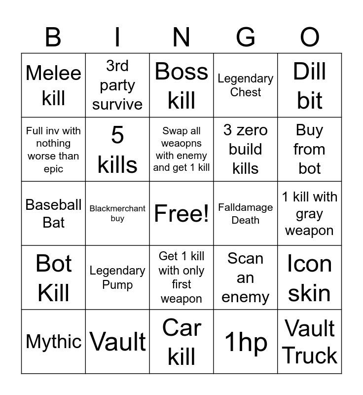 This bingo card has a free space and 24 words: Mythic, Legendary Pump, Swap all weaopns with enemy and get 1 kill, 1hp, Dill bit, Melee kill, 3rd party survive, Boss kill, Falldamage Death, 1 kill with gray weapon, Baseball Bat, 5 kills, Scan an enemy, Icon skin, Full inv with nothing worse than epic, Vault, Car kill, Legendary Chest, Buy from bot, Bot Kill, Blackmerchant buy, Get 1 kill with only first weapon, 3 zero build kills and Vault Truck.