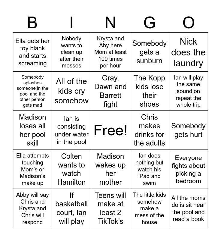 This bingo card has a free space and 25 words: Abby will say Chris and Krysta and Chris will respond, Colten wants to watch Hamilton, Gray, Dawn and Barrett fight, The little kids somehow make a mess of the house, Ian will play the same sound on repeat the whole trip, Ella gets her toy blank and starts screaming, Nobody wants to clean up after their messes, Krysta and Aby here Mom at least 100 times per hour, The Kopp kids lose their shoes, Everyone fights about picking a bedroom, Madison loses all her pool skill, All of the kids cry somehow, Ian does nothing but watch his iPad and swim, All the moms do is sit near the pool and read a book, Somebody splashes someone in the pool and the other person gets mad, If basketball court, Ian will play, Teens will make at least 2 TikTok’s, Somebody gets a sunburn, Somebody gets hurt, Ella attempts touching Mom’s or Madison‘s make up, Ian is consisting under water in the pool, Madison wakes up her mother, Chris makes drinks for the adults, Nick does the laundry and Madison loses her phone 100 times daily.