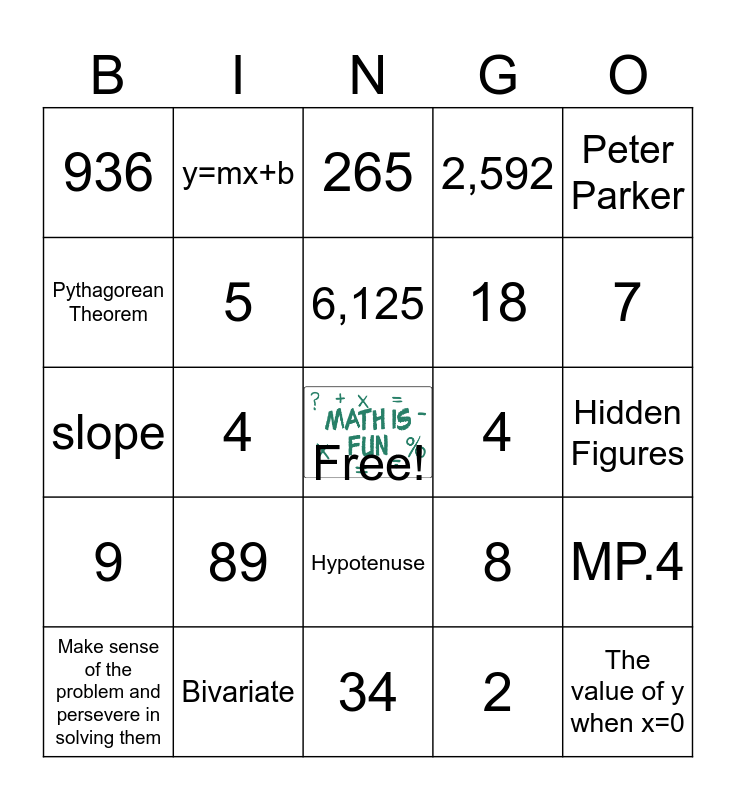 This bingo card has a free space and 24 words: 89, Bivariate, 6,125, Make sense of the problem and persevere in solving them, Peter Parker, 936, Pythagorean Theorem, y=mx+b, 4, Hypotenuse, 18, slope, 8, MP.4, 5, 2, Hidden Figures, 265, 7, 4, The value of y when x=0, 9, 2,592 and 34.