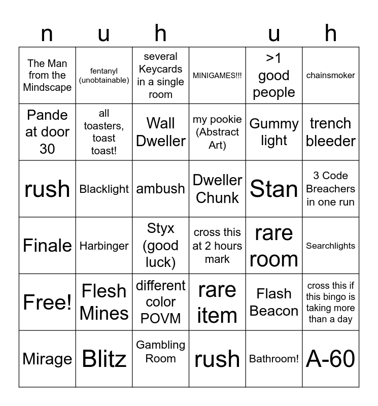 This bingo card has 48 words: pinkie, rush, ambush, rare room, Stan, rare item, fentanyl (unobtainable), froger, chainsmoker, Blitz, Pande at door 30, MINIGAMES!!!, Harbinger, Finale, A-60, different color POVM, all toasters, toast toast!, Blacklight, Free!, >1 good people, trench bleeder, Searchlights, The Man from the Mindscape, Wall Dweller, Imaginary Friend, my pookie (Abstract Art), Styx (good luck), Hand-Cranked Flashlight, 3 Code Breachers in one run, Dweller Chunk, The Necrobloxicon, Flesh Mines, Bathroom!, The funny Chest Room, cross this at 2 hours mark, Gambling Room, rush, ambush, Mirage, lamp, Flash Beacon, Free!, several Keycards in a single room, way to much Medkits, Gummy light, idc, im putting a third Free! in this, cross this if this bingo is taking more than a day and >100 documents.