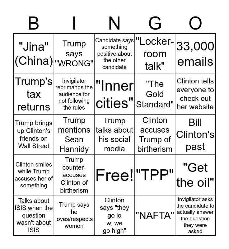 This bingo card has 26 words: Free!, "NAFTA", "Inner cities", Trump says he loves/respects women, 33,000 emails, "Jina" (China), Trump's tax returns, Trump says "WRONG", Bill Clinton's past, "TPP", "The Gold Standard", Trump brings up Clinton's friends on Wall Street, "Get the oil", Talks about ISIS when the question wasn't about ISIS, Trump mentions Sean Hannidy, Clinton mentions Alicia Machado, "Locker-room talk", Clinton smiles while Trump accuses her of something, Candidate says something positive about the other candidate, Trump talks about his social media, Clinton tells everyone to check out her website, Clinton says "they go low, we go high", Clinton accuses Trump of birtherism, Trump counter-accuses Clinton of birtherism, Invigilator reprimands the audience for not following the rules and Invigilator asks the candidate to actually answer the question they were asked.