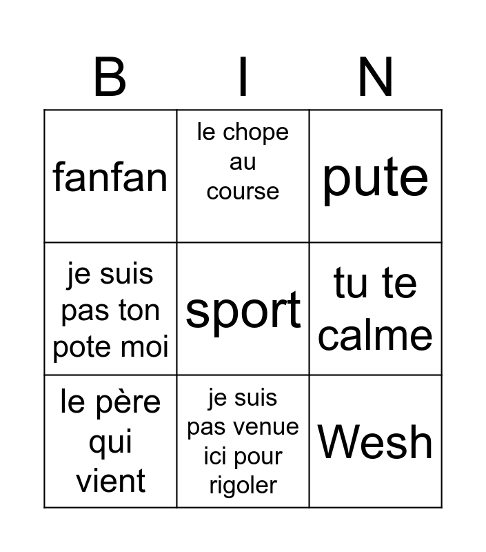 This bingo card has a free space and 8 words: tu te calme, pute, le chope au course, le père qui vient, fanfan, Wesh, je suis pas ton pote moi and je suis pas venue ici pour rigoler.