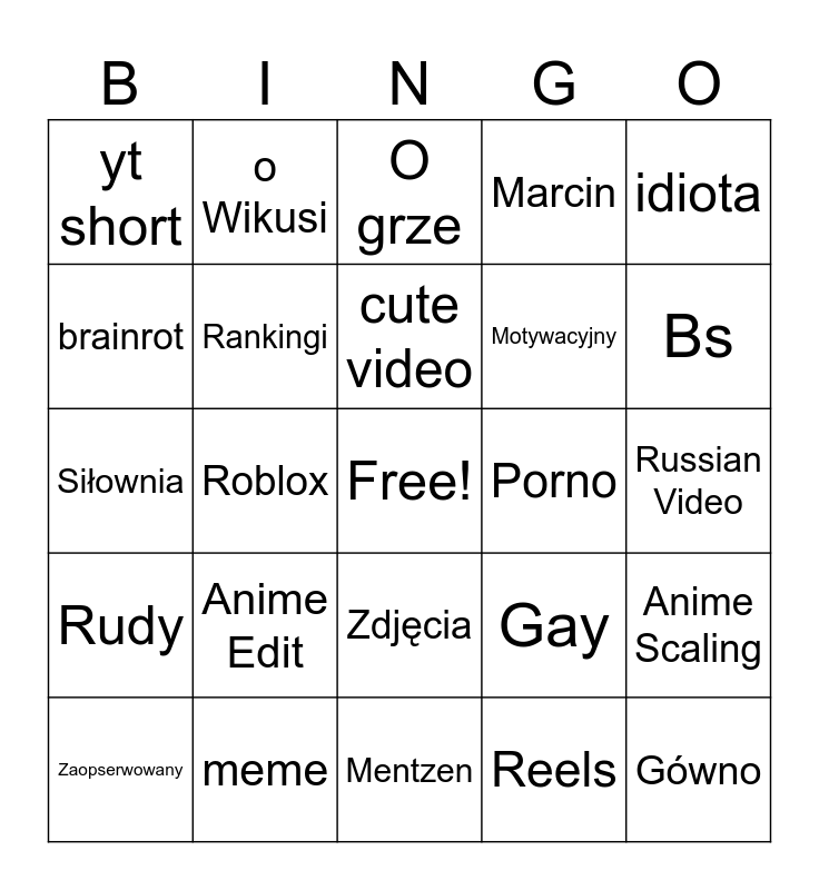 This bingo card has a free space and 24 words: Anime Edit, meme, cute video, Zaopserwowany, idiota, yt short, brainrot, o Wikusi, Porno, Zdjęcia, Motywacyjny, Siłownia, Gay, Anime Scaling, Rankingi, Reels, Russian Video, O grze, Bs, Roblox, Gówno, Rudy, Marcin and Mentzen.