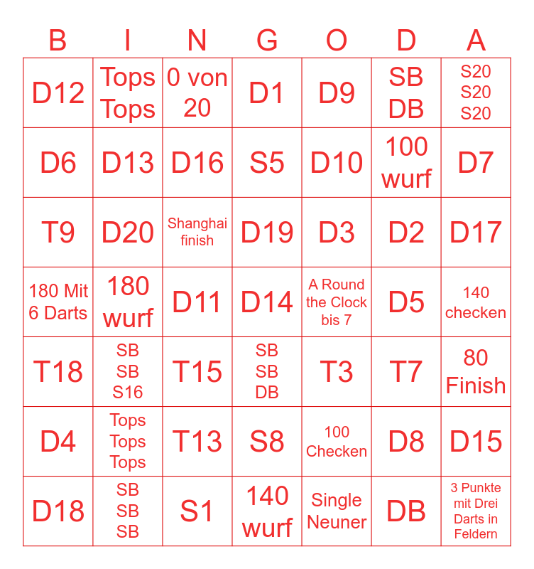 This bingo card has a free space and 48 words: 100 Checken, 100 wurf, 140 wurf, 180 wurf, Shanghai finish, 140 checken, Tops Tops, SB SB SB, SB DB, SB SB DB, S20 S20 S20, D1, D2, D3, D4, D5, D6, D7, D8, D9, D10, D11, D12, D13, D15, D16, D17, D18, D19, D20, DB, A Round the Clock bis 7, 80 Finish, Tops Tops Tops, 180 Mit 6 Darts, T3, T7, T9, T15, T13, T18, 3 Punkte mit Drei Darts in Feldern, 0 von 20, S1, S5, S8, SB SB S16 and Single Neuner.