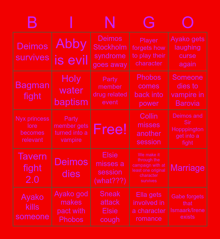 This bingo card has a free space and 24 words: Deimos dies, Ayako god makes pact with Phobos, Party member drug related event, Ayako kills someone, Ayako gets laughing curse again, Deimos survives, Bagman fight, Abby is evil, Collin misses another session, Elsie misses a session (what???), Phobos comes back into power, Nyx princess lore becomes relevant, We make it through the campaign with at least one original character survives, Marriage, Holy water baptism, Ella gets involved in a character romance, Deimos and Sir Hopppington get into a fight, Deimos Stockholm syndrome goes away, Someone dies to vampire in Barovia, Party member gets turned into a vampire, Gabe forgets that Ismaark/Irene exists, Tavern fight 2.0, Player forgets how to play their character and Sneak attack Elsie cough.