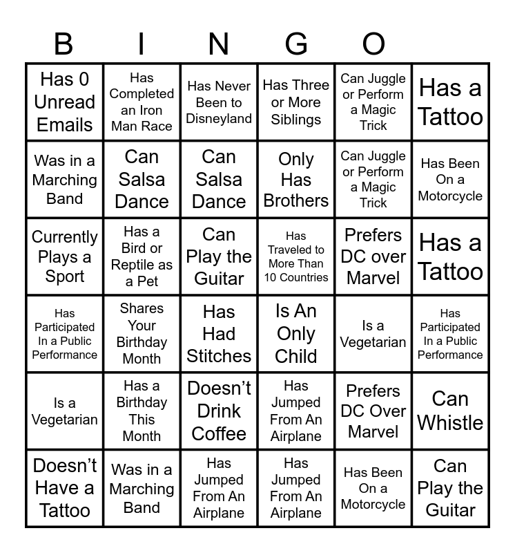 This bingo card has 92 words: Was in a Marching Band, Doesn’t Drink Coffee, Is a Vegetarian, Has Traveled to More Than 10 Countries, Can Speak a Foreign Language, Is An Only Child, Has a Tattoo, Has Had Stitches, Has Been On a Motorcycle, Has Completed an Iron Man Race, Doesn’t Have a Tattoo, Has a Birthday This Month, Has Changed a Flat Tire, Can Salsa Dance, Has Participated In a Public Performance, Can Juggle or Perform a Magic Trick, Has Never Been to Disneyland, Can Play the Guitar, Free!, Can Play the Guitar, Can Whistle, Currently Plays a Sport, Has Jumped From An Airplane, Has Three or More Siblings, Prefers DC over Marvel, Was in a Marching Band, Doesn’t Drink Coffee, Is a Vegetarian, Has Traveled to More Than 10 Countries, Can Speak a Foreign Language, Is An Only Child, Has a Tattoo, Has Had Stitches, Has Been On a Motorcycle, Has Completed an Iron Man Race, Doesn’t Have a Tattoo, Has a Birthday This Month, Has Changed a Flat Tire, Can Salsa Dance, Has Participated In a Public Performance, Can Juggle or Perform a Magic Trick, Has Traveled to More Than 10 Countries, Can Play the Guitar, Can Whistle, Currently Plays a Sport, Has Jumped From An Airplane, Has Three or More Siblings, Prefers DC Over Marvel, Volunteers for a Charity Organization, Has Read More Than 5 Books In the Past Year, Shares Your Birthday Month, Was in a Marching Band, Doesn’t Drink Coffee, Is a Vegetarian, Has Traveled to More Than 10 Countries, Can Speak a Foreign Language, Is An Only Child, Has a Tattoo, Has Had Stitches, Has Been On a Motorcycle, Has Completed an Iron Man Race, Doesn’t Have a Tattoo, Has a Birthday This Month, Has Changed a Flat Tire, Can Salsa Dance, Has Participated In a Public Performance, Can Juggle or Perform a Magic Trick, Has Traveled to More Than 10 Countries, Can Play the Guitar, Can Whistle, Currently Plays a Sport, Has Jumped From An Airplane, Has Three or More Siblings, Prefers DC Over Marvel, Volunteers for a Charity Organization, Has Read More Than 5 Books in the Past Year, Shares Your Birthday Month, Has a Degree in a STEM Field, Has Had a Job in a Mall, Has Broken a Bone, Is the Youngest Child, Has a Bird or Reptile as a Pet, Has 0 Unread Emails, Can Skateboard or Roller Skate, Has Been On TV, Moved in the Past Year, Is Wearing Contact Lenses, Has Never Gotten a Speeding Ticket, Has Driven to Canada, Only Has Sisters, Only Has Brothers and Has Played On A Football Team.