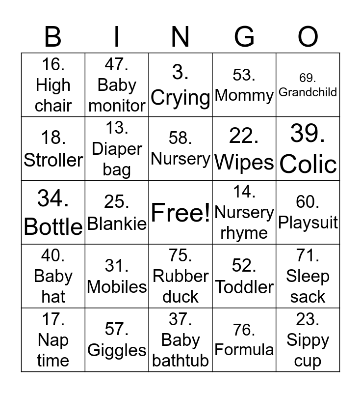 This bingo card has a free space and 84 words: Play gym, 2. Bassinet, 3. Crying, 4. Stuffed doll, 5. Bonnet, 6. Baby shampoo, 7. Bouncy seat, 8. Cravings, 9. Milk, 10. Layette, 11. Diaper pins, 12. Name, 13. Diaper bag, 14. Nursery rhyme, 15. Blankets, 16. High chair, 17. Nap time, 18. Stroller, 19. Cot, 20. Baby book, 21. Newborn, 22. Wipes, 23. Sippy cup, 24. Wash cloth, 25. Blankie, 26. Love, 27. Security blanket, 28. Bath time, 29. Playpen, 30. Baby food, 31. Mobiles, 32. Mittens, 33. Onesie, 34. Bottle, 35. Baby socks, 36. Baby walker, 37. Baby bathtub, 38. Pacifier, 39. Colic, 40. Baby hat, 41. Booties, 42. Baby lotion, 43. Granddaugther, 44. Stork, 45. Towel, 46. Blanket sleeper, 47. Baby monitor, 48. Toy box, 49. Teether, 50. Baby carrier, 51. Lullaby, 52. Toddler, 53. Mommy, 54. Ultrasound, 55. Girl, 56. Burp cloth, 57. Giggles, 58. Nursery, 59. Teddy bear, 60. Playsuit, 61. Carrycot, 62. Baby powder, 63. Baby cardigan, 64. Cradle, 65. Moses basket, 66. Bib, 67. Baby, 68. Pram suit, 69. Grandchild, 70. Gifts, 71. Sleep sack, 72. Gerber, 73. Baby shirt, 74. Pink, 75. Rubber duck, 76. Formula, 77. Diapers, 78. Rattle, 79. Baby sling, 80. Teething ring, 81. Clothes, 82. Hooded towel, 83. Family and 84. Baby swing.