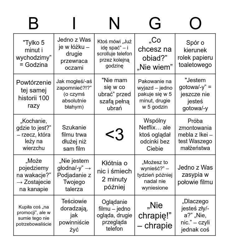This bingo card has a free space and 24 words: „Nie jestem głodna/-y” → Podjadanie z Twojego talerza, Teściowie doradzają, jak powinniście żyć, "Nie mam się w co ubrać” przed szafą pełną ubrań, Kupiła coś „na promocji”, ale w sumie tego nie potrzebowaliście, Spór o kierunek rolek papieru toaletowego, "Tylko 5 minut i wychodzimy” = Godzina, Powtórzenie tej samej historii 100 razy, Jedno z Was je w łóżku – drugie przewraca oczami, Wspólny Netflix… ale ktoś oglądał odcinki bez Ciebie, Kłótnia o nic i śmiech 2 minuty później, Pakowanie na wyjazd – jedno pakuje się w 5 minut, drugie w 5 godzin, „Kochanie, gdzie to jest?” – rzecz, która leży na wierzchu, „Możesz to wynieść?” – tydzień później nadal nie wyniesione, Jedno z Was zasypia w połowie filmu, Jak mogłeś/-aś zapomnieć?!?” (o czymś absolutnie błahym), „Nie chrapię!” – chrapie, Próba zmontowania mebla z Ikei – test Waszego małżeństwa, Ktoś mówi „Już idę spać” – i scrolluje telefon przez kolejną godzinę, "Jestem gotowa/-y” = jeszcze nie jesteś gotowa/-y, Szukanie filmu trwa dłużej niż sam film, „Dlaczego jesteś zły/-a?” „Nie, nic.” – czyli jednak coś, „Może pojedziemy na wakacje?” → Zostajecie na kanapie, „Co chcesz na obiad?” „Nie wiem” and Oglądanie filmu – jedno ogląda, drugie przegląda telefon.