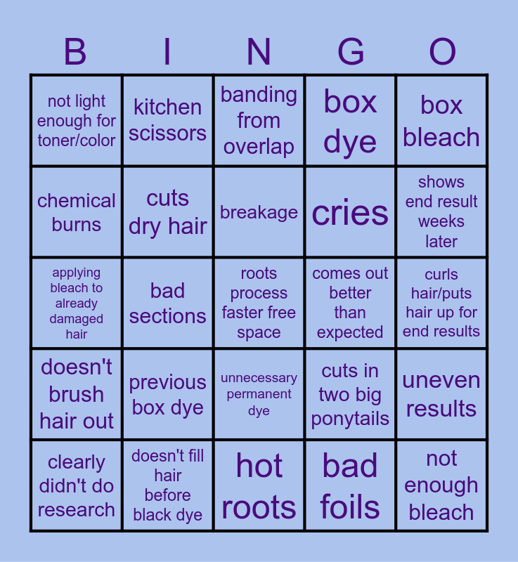 This bingo card has a free space and 42 words: unqualified tutorial, breakage, starts at the front, previous box dye, bad foils, uneven results, not enough bleach, starts at the roots, banding from overlap, unnecessary permanent dye, curls hair/puts hair up for end results, shows end result weeks later, bad sections, box bleach, unnecessarily high developer, cuts in two big ponytails, doesn't keep bleach on long enough, applying bleach to already damaged hair, bad point cutting, kitchen scissors, chemical burns, wrong toner, purple shampoo to solve everything, not light enough for toner/color, tries to lather bleach, bleach bath, cries, ends up going to professional, applies coconut oil before bleach, good results, washes hair before bleaching, doesn't brush hair out, cuts dry hair, hot roots, tries to lift color with color, clearly didn't do research, doesn't fill hair before black dye, comes out better than expected, multiple bleaches, comes out worse than expected, box dye and mentions brad mondo.