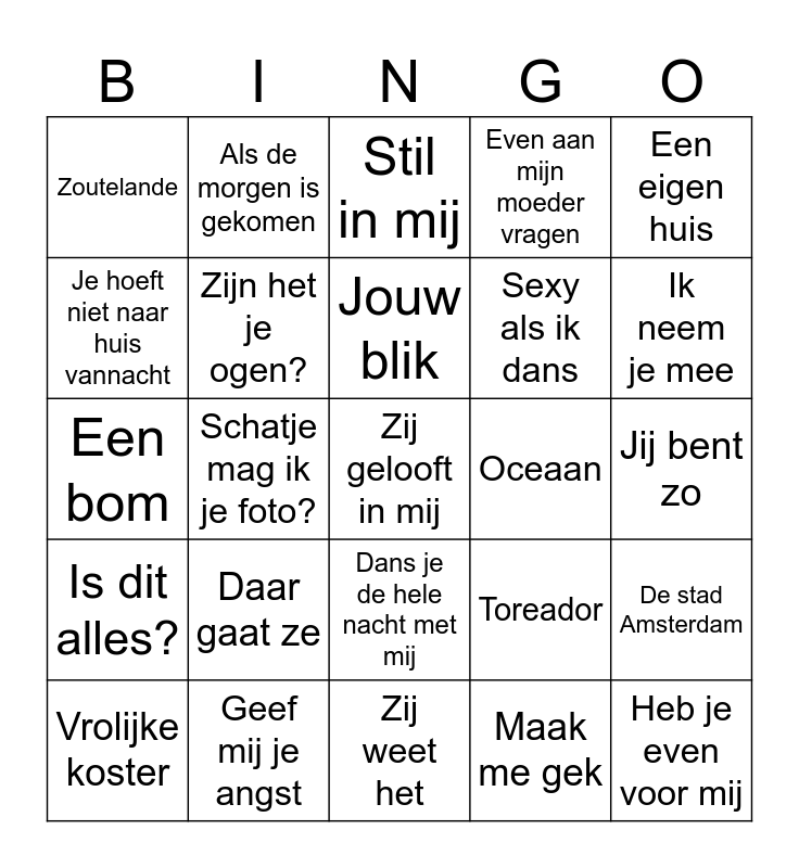 This bingo card has a free space and 27 words: Ik kan het niet alleen, Geef mij je angst, Jouw blik, Maak me gek, Een eigen huis, Je hoeft niet naar huis vannacht, Als de morgen is gekomen, Zij weet het, Oceaan, De stad Amsterdam, Is dit alles?, Zijn het je ogen?, Toreador, Heb je even voor mij, Een bom, Atje voor de sfeer, Stil in mij, Even aan mijn moeder vragen, Jij bent zo, Zoutelande, Daar gaat ze, Dans je de hele nacht met mij, Sexy als ik dans, Ik neem je mee, Vrolijke koster, Schatje mag ik je foto? and Oh kleine jodeljongen.