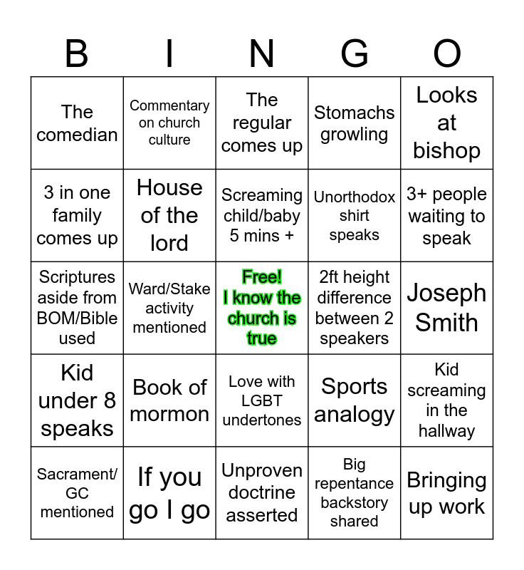 This bingo card has a free space and 38 words: The storymony, Ending without the formal testimony, Mention fasting, House of the lord, Kid screaming in the hallway, Book of mormon, Screaming child/baby 5 mins +, Financial problems, Looks at bishop, Unorthodox shirt speaks, Ward/Stake activity mentioned, Stomachs growling, Bringing up work, Joseph Smith, 3 in one family comes up, Kid under 8 speaks, Ward inside joke, The regular comes up, The house of the lord mentioned, 2ft height difference between 2 speakers, The comedian, If you go I go, 3+ people waiting to speak, Sacrament/ GC mentioned, Embarrassingly story or incident, Unproven doctrine asserted, God humbling me story, Plan of salvation, Specific scripture quoted, Story as a kid, Wife shout-out, Love with LGBT undertones, Big repentance backstory shared, Commentary on church culture, Claiming a favorite apostle, Sports analogy, Scriptures aside from BOM/Bible used and 2-5 min gap of silence.