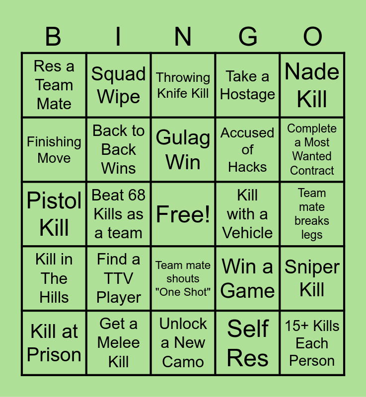 This bingo card has a free space and 24 words: Find a TTV Player, Get a Melee Kill, Gulag Win, Kill at Prison, Nade Kill, Res a Team Mate, Finishing Move, Squad Wipe, Kill with a Vehicle, Team mate shouts "One Shot", Accused of Hacks, Pistol Kill, Win a Game, Sniper Kill, Back to Back Wins, Self Res, Team mate breaks legs, Throwing Knife Kill, Complete a Most Wanted Contract, Beat 68 Kills as a team, 15+ Kills Each Person, Kill in The Hills, Take a Hostage and Unlock a New Camo.