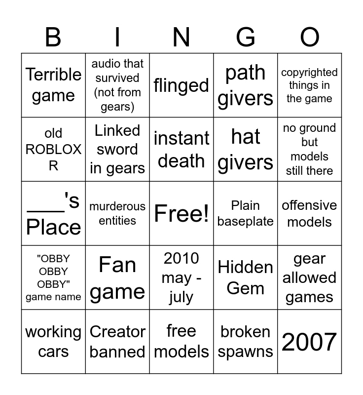 This bingo card has a free space and 24 words: Fan game, Creator banned, instant death, working cars, copyrighted things in the game, Terrible game, old ROBLOX R, audio that survived (not from gears), Plain baseplate, 2010 may - july, hat givers, ___'s Place, Hidden Gem, gear allowed games, Linked sword in gears, broken spawns, offensive models, flinged, no ground but models still there, murderous entities, 2007, "OBBY OBBY OBBY" game name, path givers and free models.