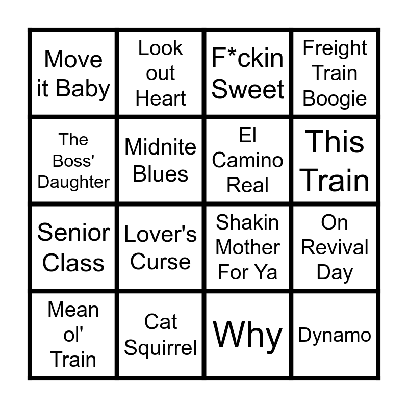 This bingo card has 16 words: Cat Squirrel, On Revival Day, F*ckin Sweet, Move it Baby, Senior Class, Look out Heart, Shakin Mother For Ya, Why, The Boss' Daughter, Midnite Blues, Mean ol' Train, Freight Train Boogie, Lover's Curse, This Train, El Camino Real and Dynamo.