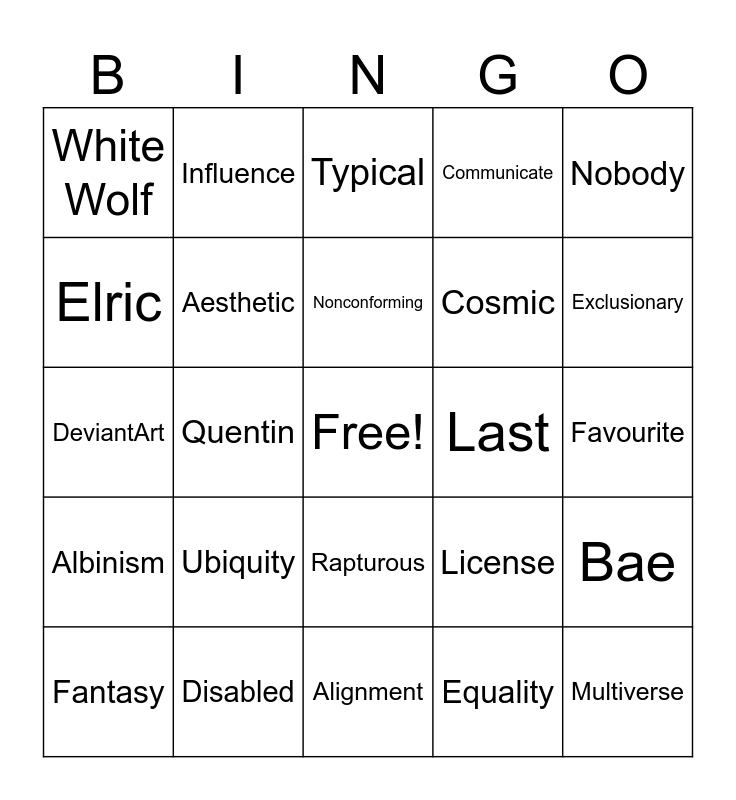 This bingo card has a free space and 24 words: Ubiquity, Disabled, Nonconforming, Fantasy, Nobody, White Wolf, Elric, Influence, Last, Rapturous, Cosmic, DeviantArt, License, Bae, Aesthetic, Equality, Favourite, Typical, Exclusionary, Quentin, Multiverse, Albinism, Communicate and Alignment.
