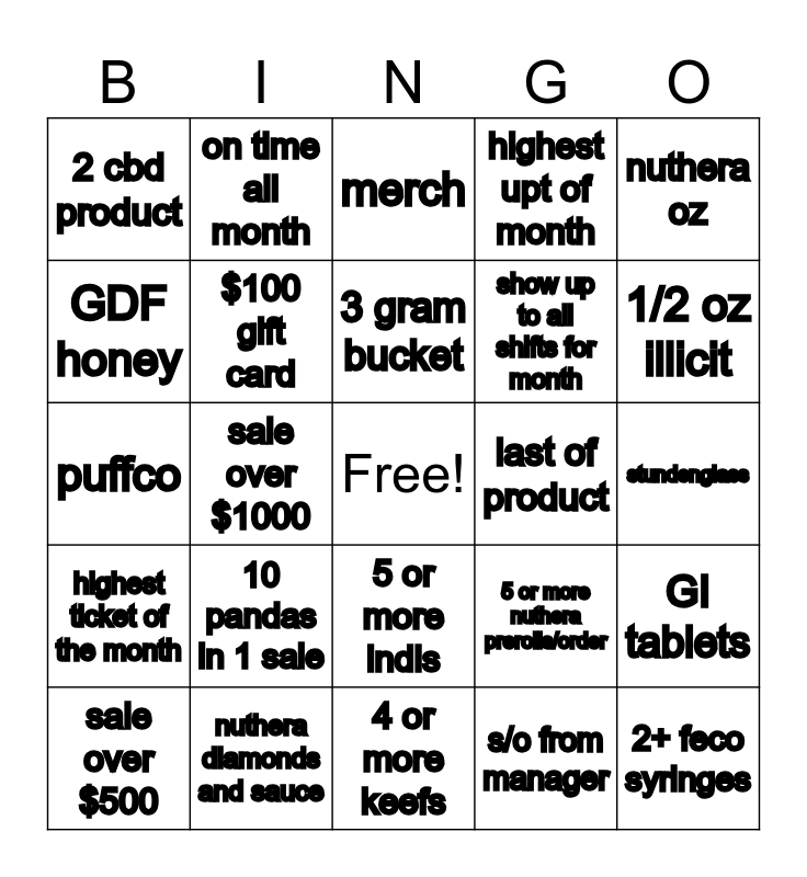 This bingo card has a free space and 24 words: sale over $500, 10 pandas in 1 sale, 3 gram bucket, s/o from manager, nuthera oz, 2 cbd product, on time all month, merch, last of product, stundenglass, puffco, $100 gift card, 5 or more nuthera prerolls/order, GI tablets, GDF honey, nuthera diamonds and sauce, 4 or more keefs, highest upt of month, 1/2 oz illicit, highest ticket of the month, sale over $1000, 5 or more indis, show up to all shifts for month and 2+ feco syringes.