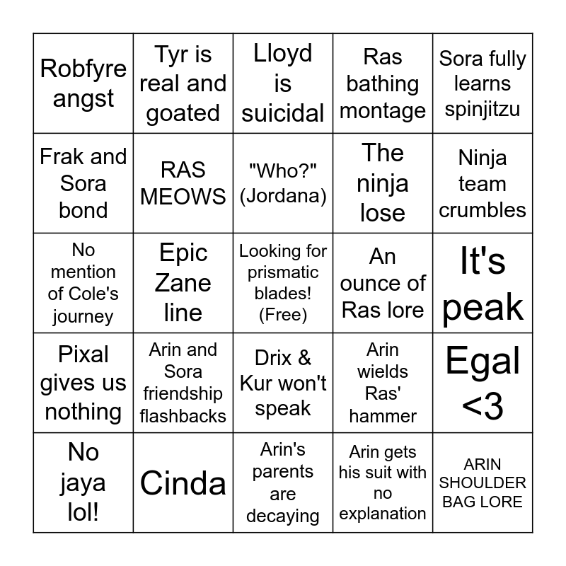 This bingo card has a free space and 24 words: Arin and Sora friendship flashbacks, Cinda, "Who?"(Jordana), No jaya lol!, Sora fully learns spinjitzu, Robfyre angst, Frak and Sora bond, Tyr is real and goated, An ounce of Ras lore, Drix & Kur won't speak, The ninja lose, No mention of Cole's journey, Arin wields Ras' hammer, Egal <3, RAS MEOWS, Arin gets his suit with no explanation, It's peak, Lloyd is suicidal, Ninja team crumbles, Epic Zane line, ARIN SHOULDER BAG LORE, Pixal gives us nothing, Ras bathing montage and Arin's parents are decaying.