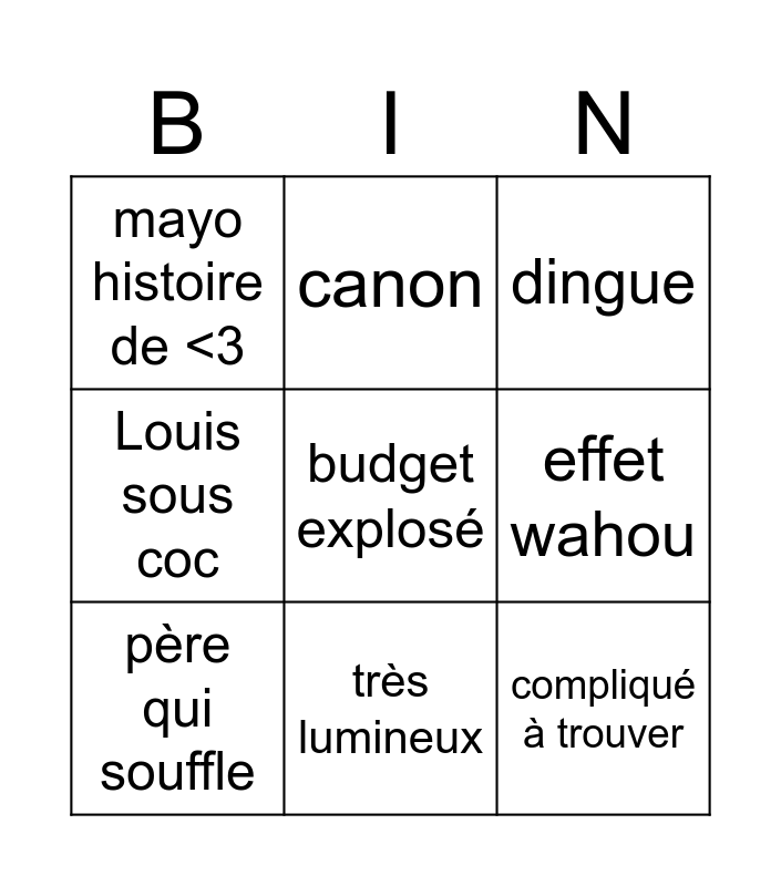 This bingo card has a free space and 8 words: effet wahou, dingue, canon, père qui souffle, mayo histoire de <3, compliqué à trouver, Louis sous coc and très lumineux.