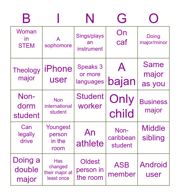 This bingo card has 25 words: Youngest person in the room, Oldest person in the room, Speaks 3 or more languages, Doing a double major, Doing major/minor, Woman in STEM, Theology major, A sophomore, Only child, An athlete, A bajan, Non-dorm student, Non-caribbean student, Middle sibling, iPhone user, Android user, Business major, Sings/plays an instrument, Same major as you, Non international student, Student worker, Has changed their major at least once, Can legally drive, On caf and ASB member.