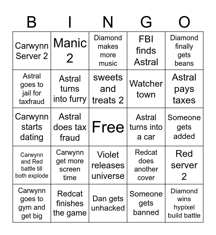 This bingo card has a free space and 24 words: Carwynn get more screen time, Redcat finishes the game, sweets and treats 2, Carwynn goes to gym and get big, Diamond finally gets beans, Carwynn Server 2, Astral goes to jail for taxfraud, Manic 2, Astral turns into a car, Violet releases universe, Watcher town, Carwynn starts dating, Redcat does another cover, Red server 2, Astral turns into furry, Someone gets banned, Someone gets added, Diamond makes more music, Astral pays taxes, Astral does tax fraud, Diamond wins hypixel build battle, Carwynn and Red battle till both explode, FBI finds Astral and Dan gets unhacked.