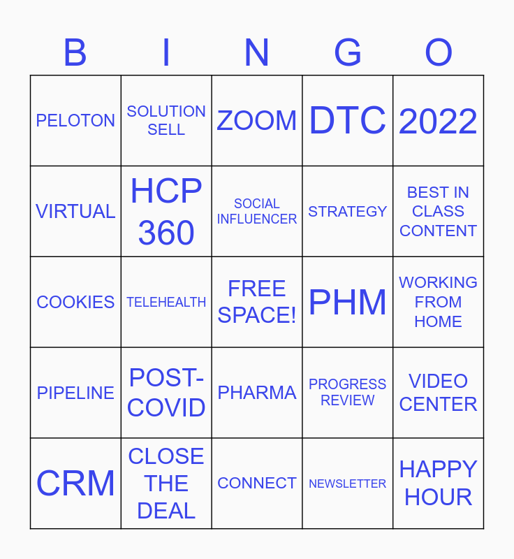 This bingo card has a free space and 29 words: CRM, KILLING IT, TELEHEALTH, UPFRONTS, PELOTON, ZOOM, HCP 360, POST-COVID, PHM, CLOSE THE DEAL, WORKING FROM HOME, HAPPY HOUR, CONNECT, NEWSLETTER, BEST IN CLASS CONTENT, RIGHT NOW, PHARMA, PIPELINE, 2022, COOKIES, PROGRESS REVIEW, CASE STUDY, STRATEGY, VIRTUAL, DTC, SOLUTION SELL, VIDEO CENTER, SOCIAL INFLUENCER and YOY GROWTH.