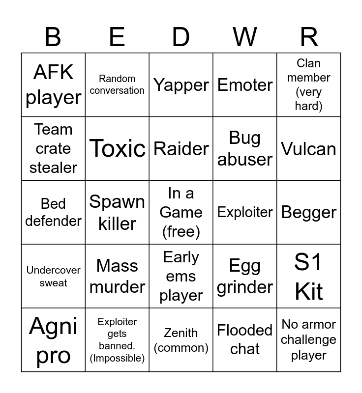 This bingo card has a free space and 24 words: Agni pro, Mass murder, Raider, Flooded chat, Clan member (very hard), AFK player, Random conversation, Yapper, Exploiter, Begger, Bed defender, Toxic, Egg grinder, S1 Kit, Team crate stealer, Exploiter gets banned. (Impossible), Zenith (common), Emoter, Vulcan, Undercover sweat, Spawn killer, Early ems player, Bug abuser and No armor challenge player.