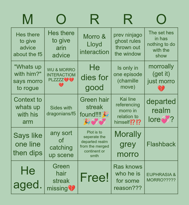 This bingo card has 25 words: Says like one line then dips, Green hair streak missing💔, Green hair streak found‼️‼️🎉🎉💞💞, Ras knows who he is for some reason???, The set hes in has nothing to do with the show, Hes there to give advice about the f5, Hes there to give arin advice, Morro & Lloyd interaction, Kai line referencing morro in relation to himself⁉️⁉️, Flashback, "Whats up with him?" says morro to rogue, WU & MORRO INTERACTIOM PLZZZZ💔💔💔, Free!, Morally grey morro, morroally (get it) just morro💔, He aged., Sides with dragonians/f5, He dies for good, Is only in one episode (chamille move), departed realm lore💞?, Context to whats up with his arm, any sort of catching up scene, Plot is to seperate the departed realm from the merged continent or smth, prev ninjago ghost rules thrown out the window and EUPHRASIA & MORRO?????.