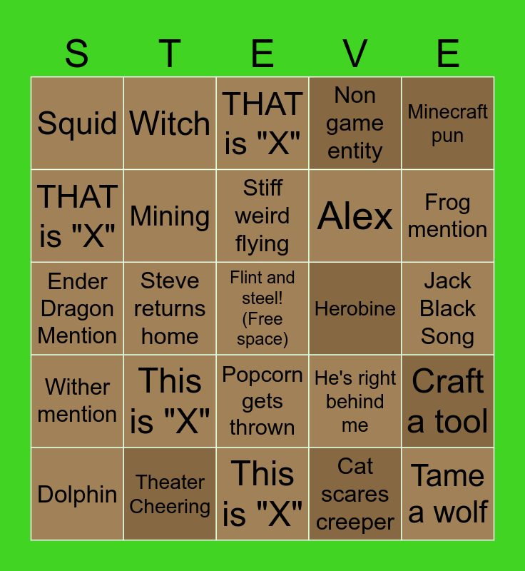This bingo card has a free space and 24 words: This is "X", Theater Cheering, Stiff weird flying, Dolphin, Minecraft pun, Squid, THAT is "X", Witch, Herobine, Popcorn gets thrown, Alex, Ender Dragon Mention, He's right behind me, Craft a tool, Mining, Cat scares creeper, Jack Black Song, THAT is "X", Frog mention, Steve returns home, Tame a wolf, Wither mention, Non game entity and This is "X".