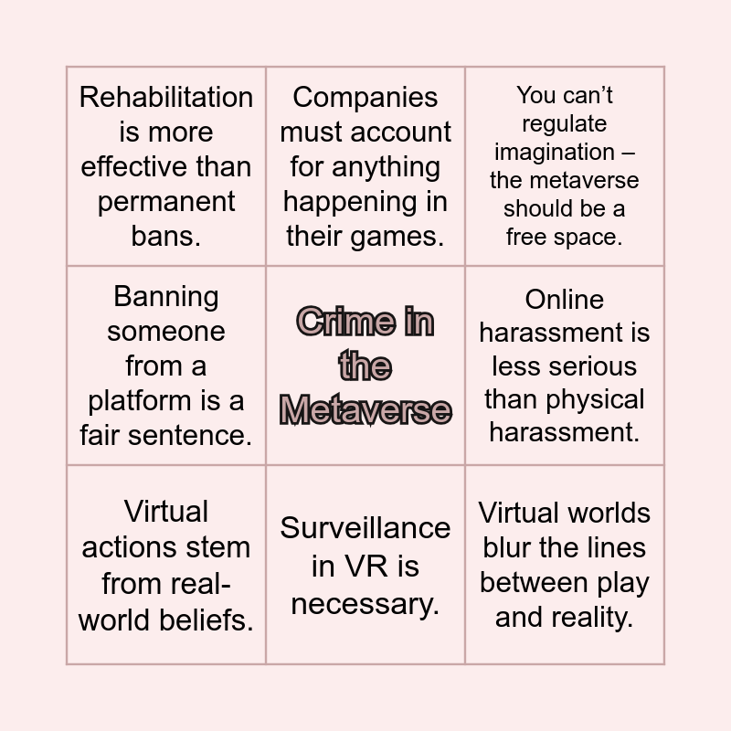 This bingo card has a free space and 8 words: Online harassment is less serious than physical harassment., You can’t regulate imagination – the metaverse should be a free space., Companies must account for anything happening in their games., Virtual actions stem from real-world beliefs., Rehabilitation is more effective than permanent bans., Virtual worlds blur the lines between play and reality., Banning someone from a platform is a fair sentence. and Surveillance in VR is necessary..