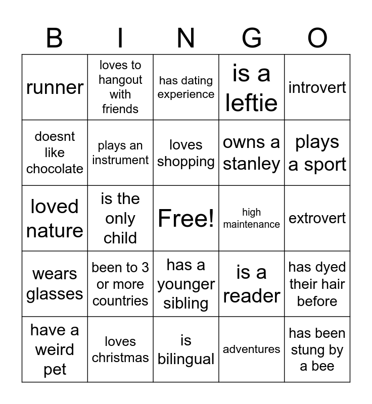 This bingo card has a free space and 24 words: have a weird pet, been to 3 or more countries, loves shopping, adventures, introvert, runner, loves to hangout with friends, has dating experience, high maintenance, extrovert, loved nature, plays an instrument, is a reader, has dyed their hair before, doesnt like chocolate, loves christmas, is bilingual, is a leftie, plays a sport, wears glasses, is the only child, has a younger sibling, owns a stanley and has been stung by a bee.