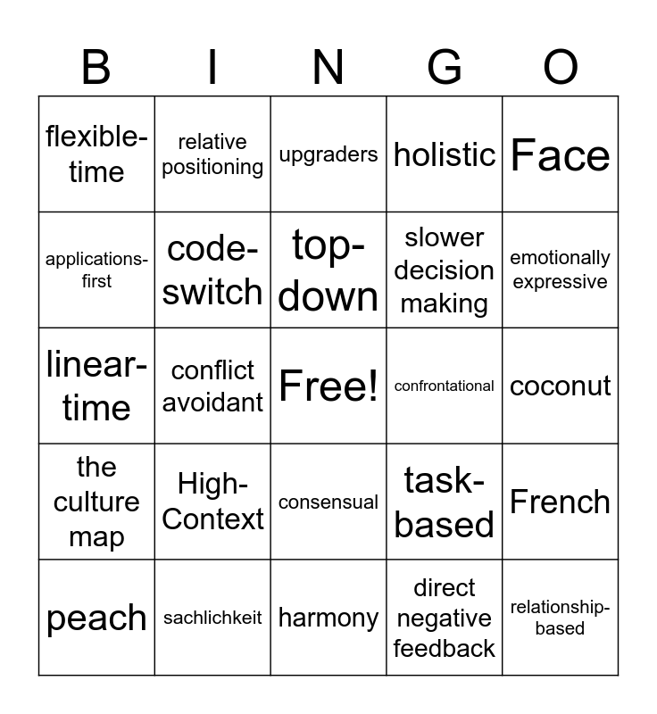 This bingo card has a free space and 24 words: High-Context, sachlichkeit, top-down, peach, Face, flexible-time, applications-first, relative positioning, confrontational, consensual, slower decision making, linear-time, task-based, French, code-switch, direct negative feedback, coconut, upgraders, emotionally expressive, conflict avoidant, relationship-based, the culture map, holistic and harmony.