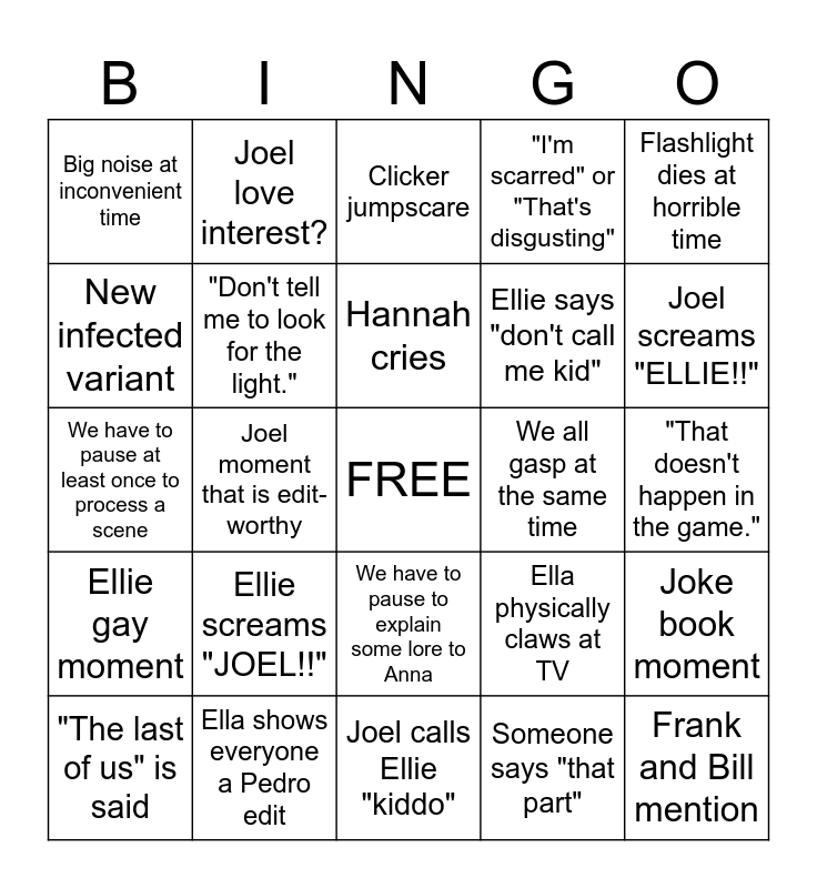 This bingo card has a free space and 24 words: Ellie screams "JOEL!!", Ella shows everyone a Pedro edit, Hannah cries, "The last of us" is said, Flashlight dies at horrible time, Big noise at inconvenient time, New infected variant, Joel love interest?, We all gasp at the same time, We have to pause to explain some lore to Anna, Ellie says "don't call me kid", We have to pause at least once to process a scene, Ella physically claws at TV, Joke book moment, "Don't tell me to look for the light.", Someone says "that part", "That doesn't happen in the game.", Clicker jumpscare, Joel screams "ELLIE!!", Joel moment that is edit-worthy, Frank and Bill mention, Ellie gay moment, "I'm scarred" or "That's disgusting" and Joel calls Ellie "kiddo".