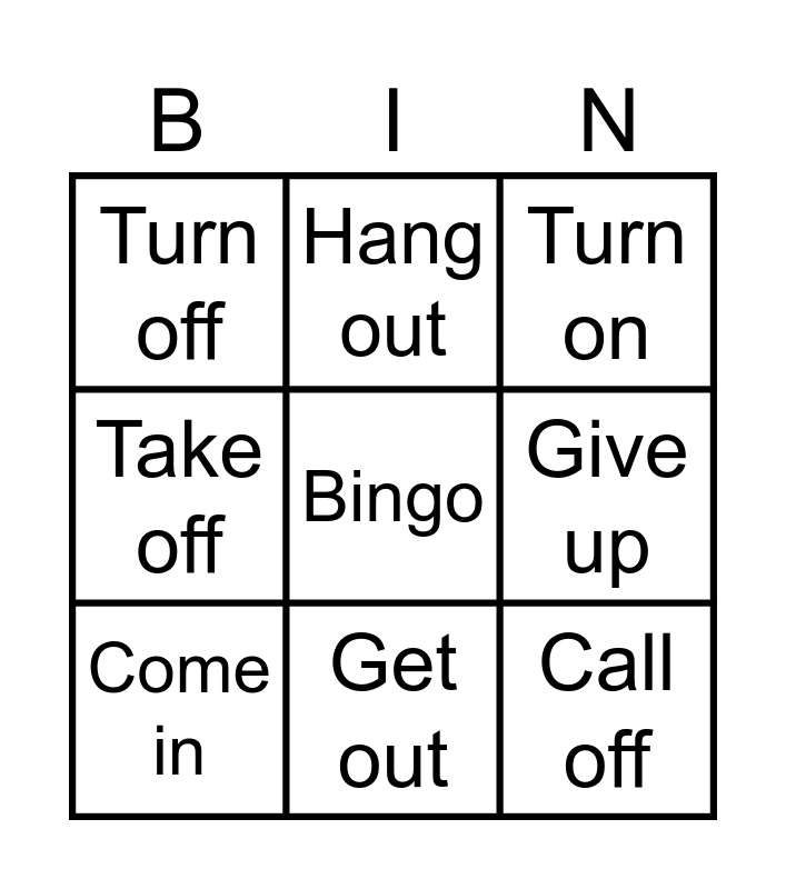 This bingo card has a free space and 17 words: Get up, Wake up, Turn on, Turn off, Put on, Take off, Look for, Come in, Get out, Give up, Run out of, Break up, Call off, Hang out, Look foward to, Pick up and Take care of.