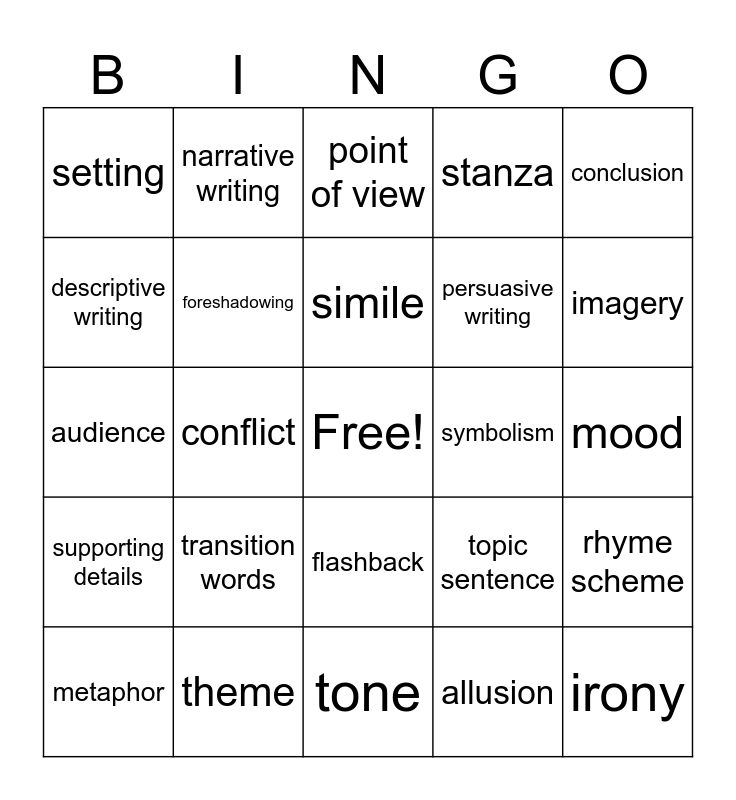 This bingo card has a free space and 30 words: theme, plot, conflict, characterization, setting, point of view, foreshadowing, flashback, symbolism, tone, mood, irony, allusion, allegory, imagery, thesis statement, topic sentence, supporting details, transition words, conclusion, audience, purpose, narrative writing, persuasive writing, descriptive writing, stanza, rhyme scheme, metaphor, simile and Giving human traits to non-human things.