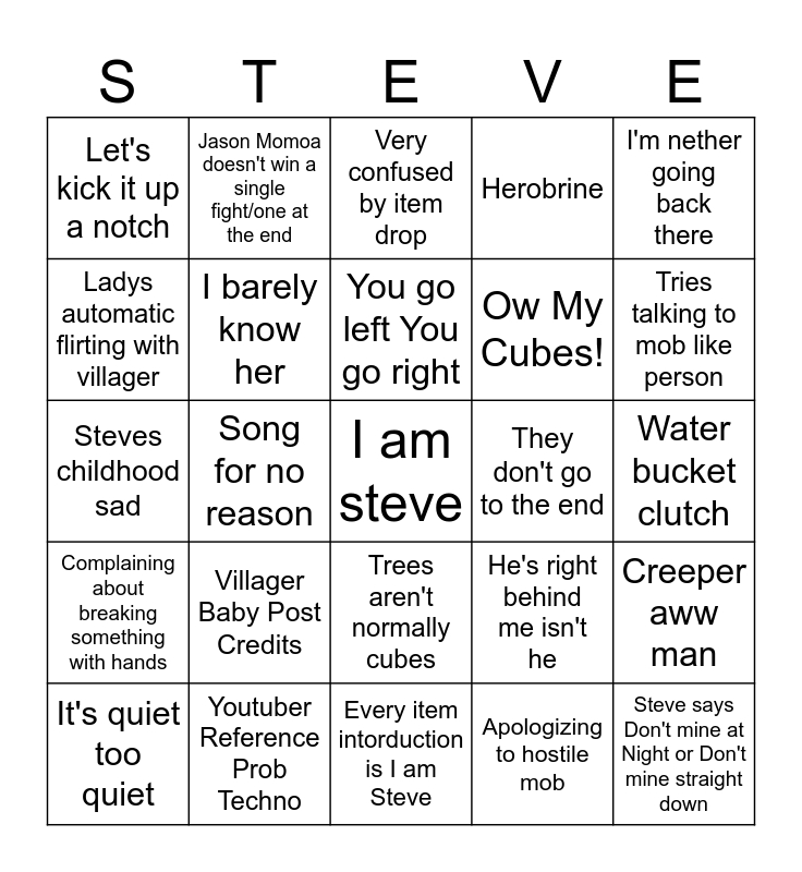 This bingo card has a free space and 24 words: Villager Baby Post Credits, Youtuber Reference Prob Techno, You go left You go right, It's quiet too quiet, I'm nether going back there, Let's kick it up a notch, Ladys automatic flirting with villager, Jason Momoa doesn't win a single fight/one at the end, They don't go to the end, Trees aren't normally cubes, Ow My Cubes!, Steves childhood sad, He's right behind me isn't he, Creeper aww man, I barely know her, Apologizing to hostile mob, Water bucket clutch, Very confused by item drop, Tries talking to mob like person, Song for no reason, Steve says Don't mine at Night or Don't mine straight down, Complaining about breaking something with hands, Herobrine and Every item intorduction is I am Steve.