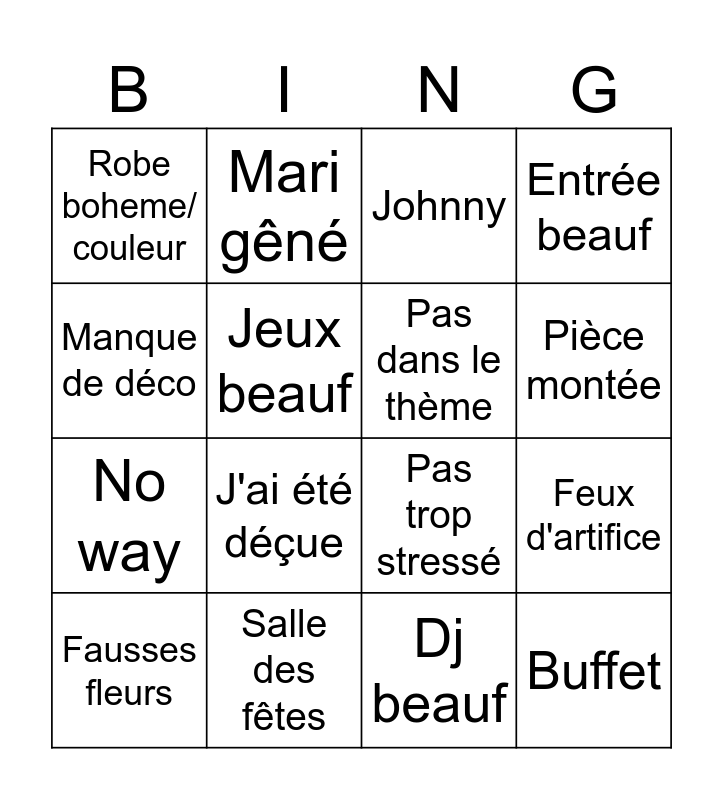 This bingo card has 16 words: Fausses fleurs, Salle des fêtes, Johnny, Entrée beauf, Manque de déco, Mari gêné, Pas trop stressé, Feux d'artifice, Robe boheme/ couleur, Jeux beauf, Dj beauf, Pièce montée, No way, J'ai été déçue, Pas dans le thème and Buffet.