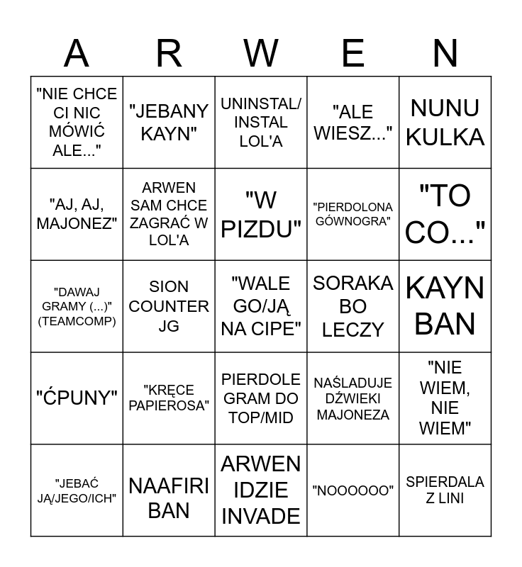 This bingo card has 25 words: "ĆPUNY", NAAFIRI BAN, "WALE GO/JĄ NA CIPE", "NOOOOOO", NUNU KULKA, "NIE CHCE CI NIC MÓWIĆ ALE...", "JEBANY KAYN", UNINSTAL/ INSTAL LOL'A, SORAKA BO LECZY, "NIE WIEM, NIE WIEM", "AJ, AJ, MAJONEZ", ARWEN SAM CHCE ZAGRAĆ W LOL'A, ARWEN IDZIE INVADE, NAŚLADUJE DŹWIEKI MAJONEZA, "TO CO...", "JEBAĆ JĄ/JEGO/ICH", SION COUNTER JG, "W PIZDU", "PIERDOLONA GÓWNOGRA", KAYN BAN, "DAWAJ GRAMY (...)" (TEAMCOMP), "KRĘCE PAPIEROSA", PIERDOLE GRAM DO TOP/MID, "ALE WIESZ..." and SPIERDALA Z LINI.