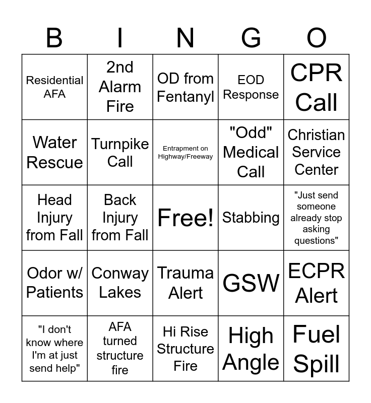 This bingo card has a free space and 24 words: Conway Lakes, AFA turned structure fire, Entrapment on Highway/Freeway, "I don't know where I'm at just send help", CPR Call, Residential AFA, Water Rescue, 2nd Alarm Fire, Stabbing, Trauma Alert, "Odd" Medical Call, Head Injury from Fall, GSW, ECPR Alert, Turnpike Call, High Angle, "Just send someone already stop asking questions", OD from Fentanyl, Christian Service Center, Back Injury from Fall, Fuel Spill, Odor w/ Patients, EOD Response and Hi Rise Structure Fire.
